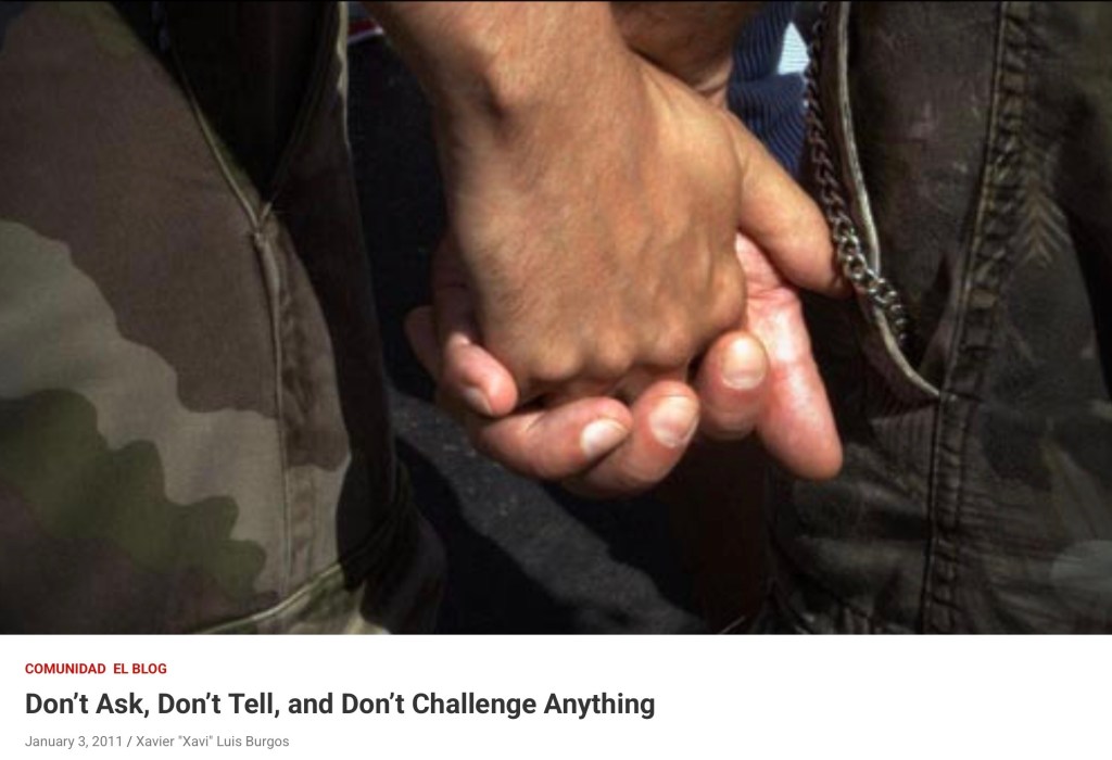 Luis Aponte-Parés and Jorge B. Merced in “Página Omitídas: The Gay and Lesbian Presence,” pinpoint the socio-historical origins of a movement that initially sought radical social transformation and an agenda of cross-cultural and political connections to one that “excluded or subordinated other types of oppressions.” In their study of the Puerto Rican and Latina/o presence in the emergence of an LGBTQ movement in the 1960s and 1970s, they saw that those with power, capital, and access created an agenda that served their interests, which were for white, middle-class gay men, and at times, women. This exclusive vision is evident even in the DADT spectacle, where the presence of transgender voices were absent. But those deviants don’t matter, right?