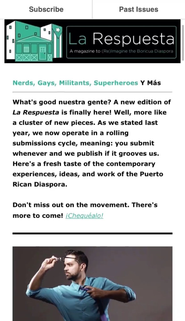 I served as Editor-in-Chief and Chief Designer for La Respuesta magazine (2013-2018). The internet-based publication had collectives in Chicago and New York City, published the work of 300 Puerto Ricans, and reached over a million monthly readers.