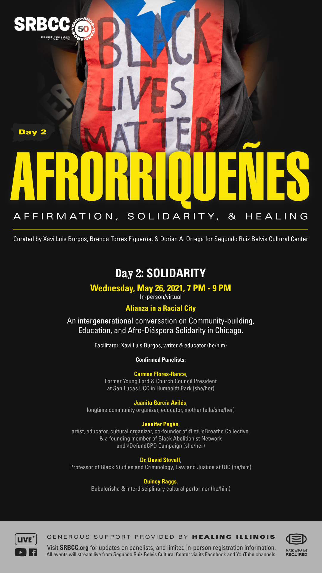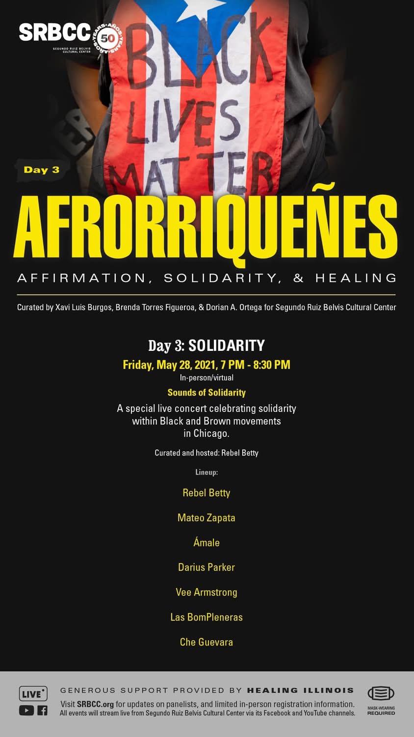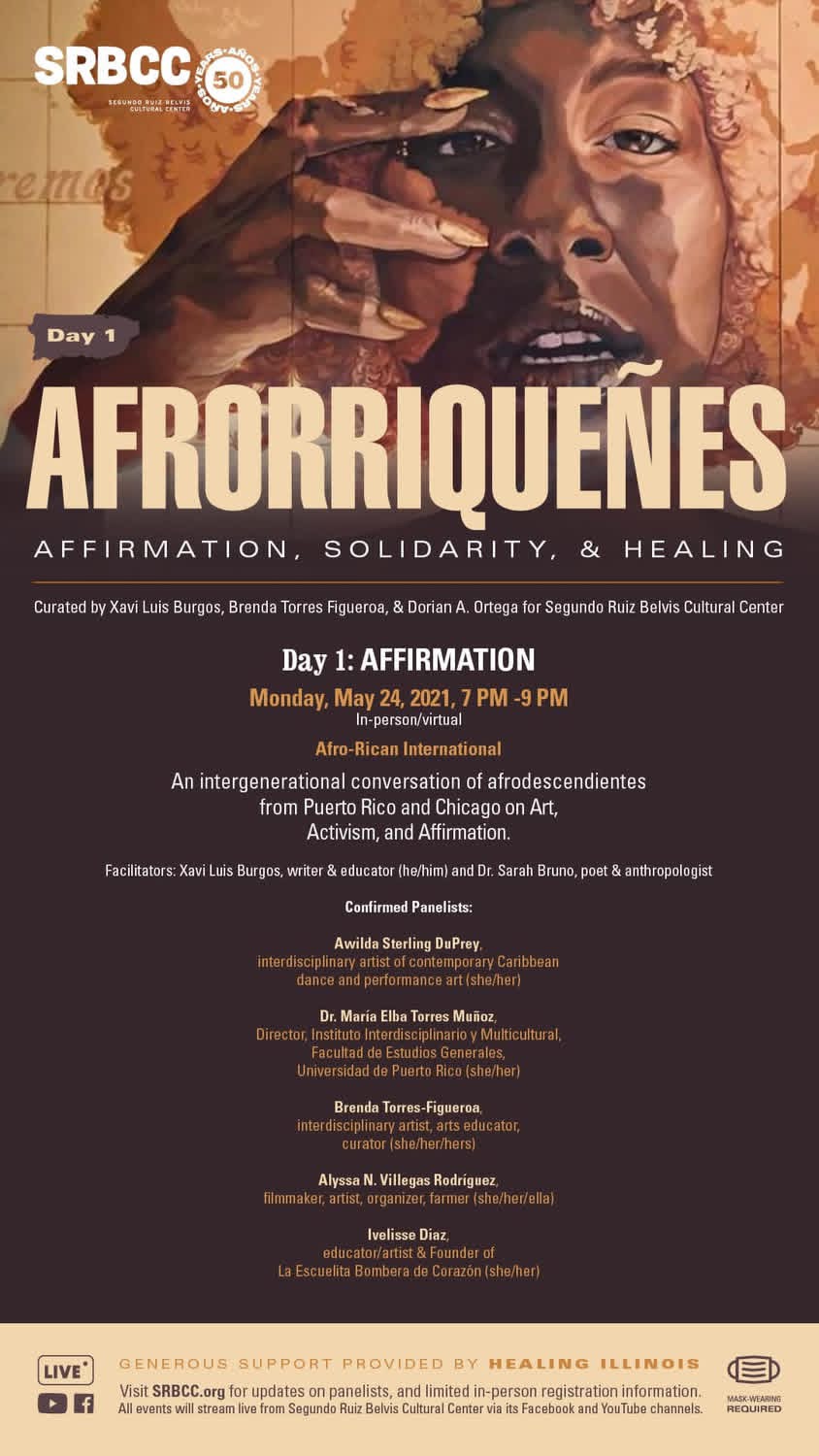 In 2021, I co-developed a four-day conference on Black affirmation, healing, solidarity, and Afro-Puerto Rican island and diasporic identities. I organized this with community-based artists and activists at Chicago’s oldest Puerto Rican arts organization.